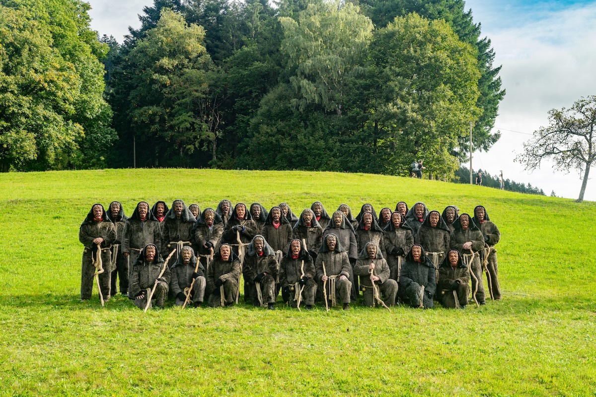 Die Holzmaske zeigt ein wüstes Gesicht mit langer Nase, als Kopfbedeckung trägt das Hagekätherle einen wunderschönen Rosenhut.